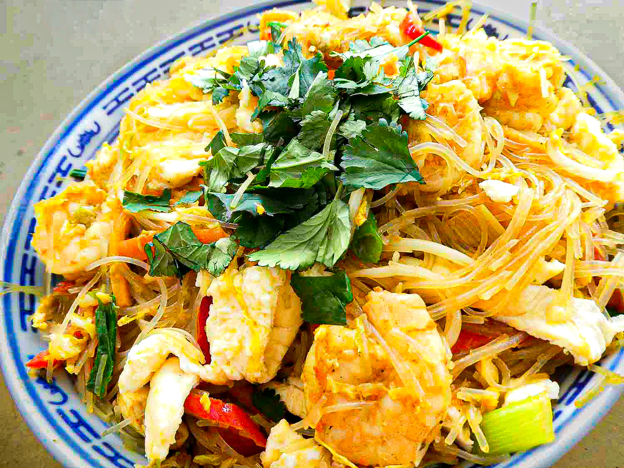 Cantonese chefs in Hong Kong created this dish by adding curry powder for a Southeast Asian flavour. They called it “Singapore Noodles” to make it sound more exotic. In Singapore, locals eat a similar dish called fried bee hoon (炒米粉), but it doesn’t have curry flavour.